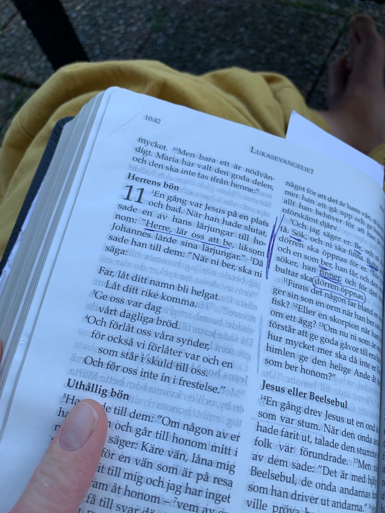 Att få sitta med min bibel. Att få vara i Guds ord, liksom tugga på ordet. Det är något som jag tycker är så ljuvligt. Just idag hamnade jag i bönen Fader vår, en bön som liksom funkar i livets alla omständigheter.