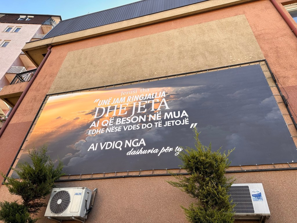 Efter mellanlandning i München, som för övrigt jag klassar som både rörig och organiserad flygplats, landar vi i Pristina på onsdagkvällen. Blir upphämtade och får ett härligt välkomnade. Kommer till kyrkan och möts av denna skylt som är för hela staden att se på väggen utanför kyrkan ”Jesus sa: jag är uppståndelsen och livet, den som tror på mig ska ha liv och liv i överflöd.” Wow men gillar deras sätt som kommer så naturligt att visa vem Jesus är.